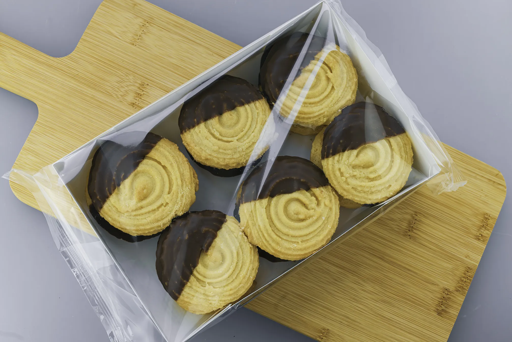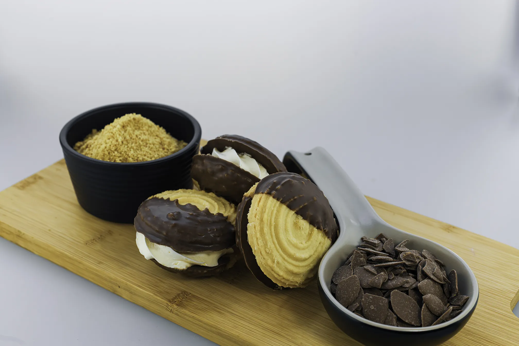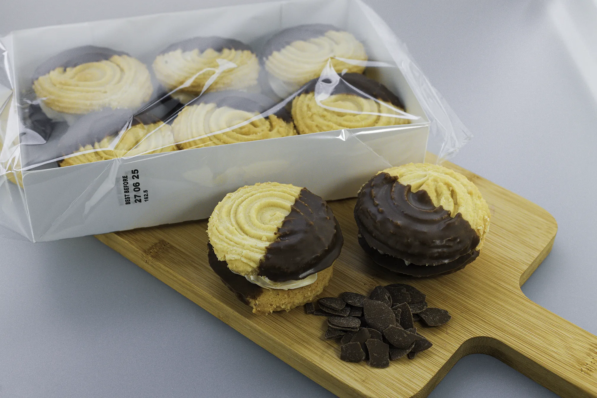 Viennese biscuits dipped in milk chocolate flavour coating and sandwiched together with a creamy filling.