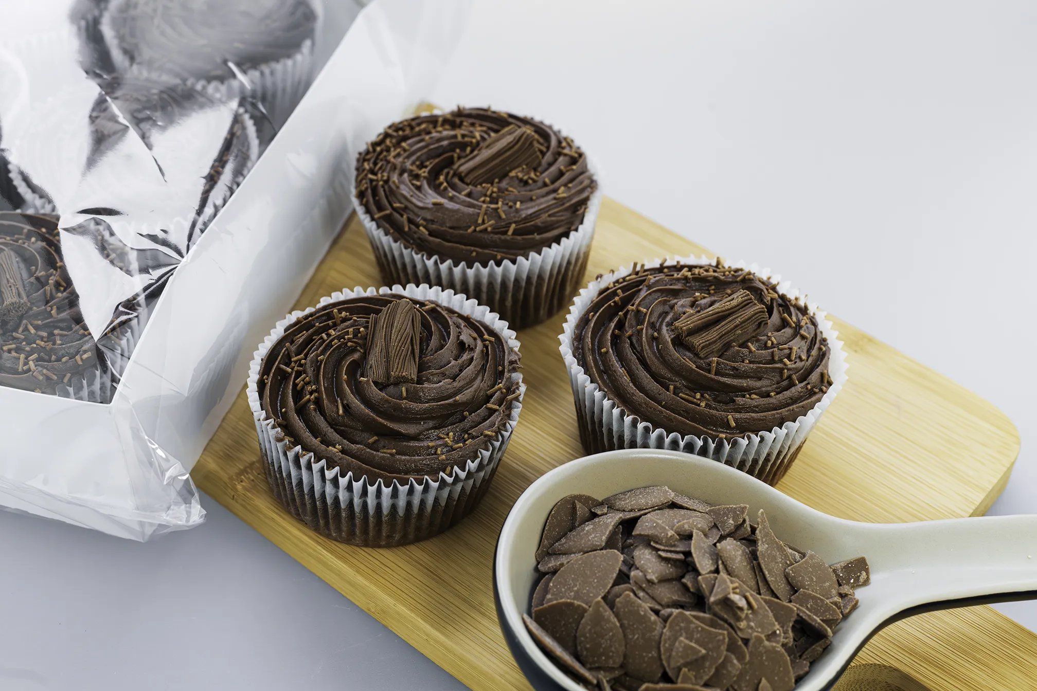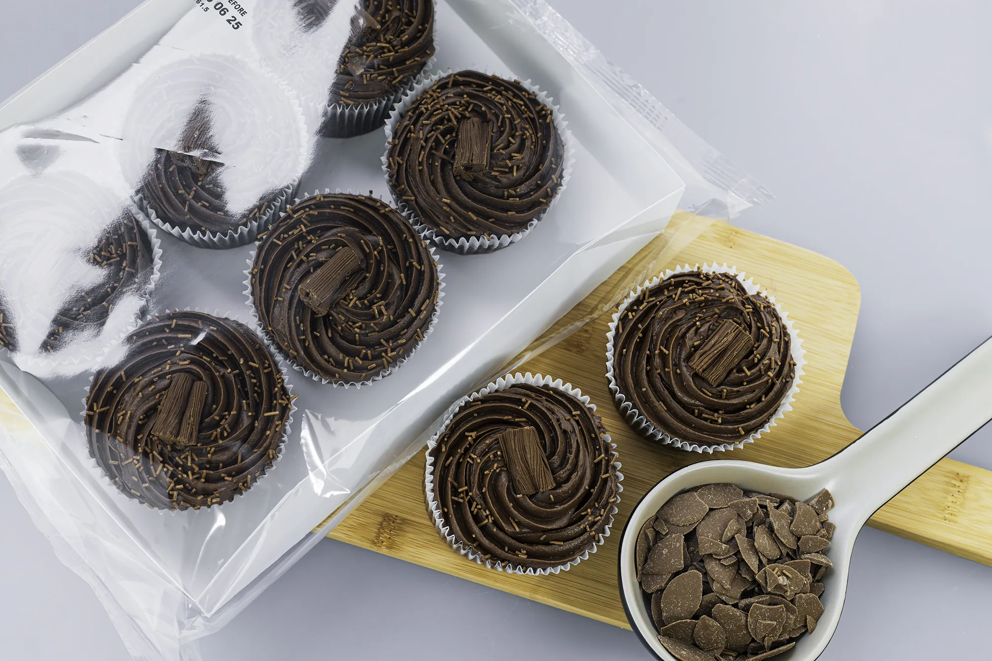 A moist chocolate sponge topped with chocolate frosting and a chocolate flake.