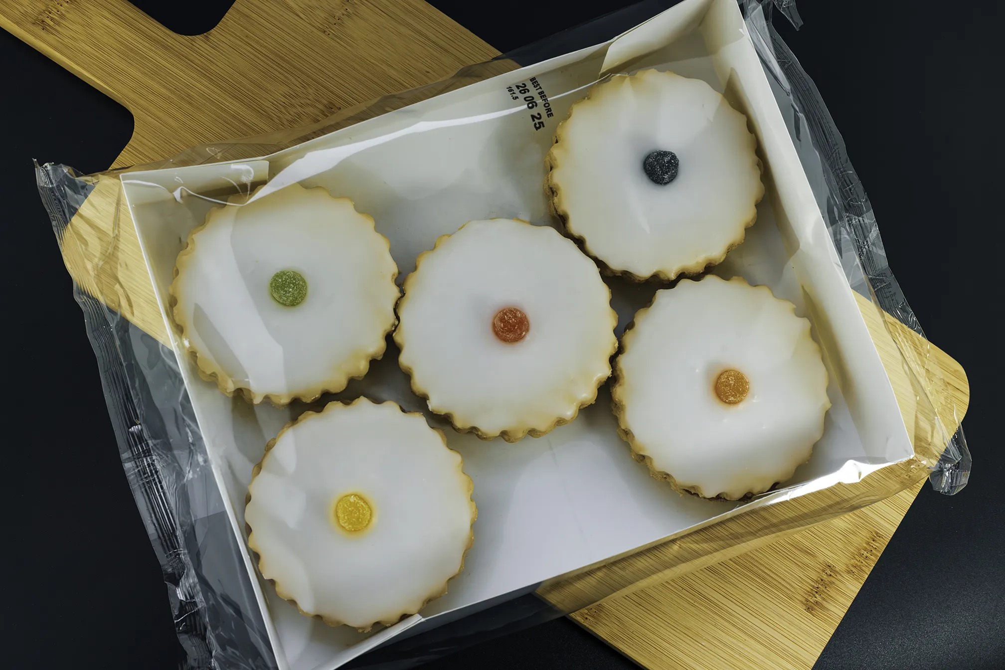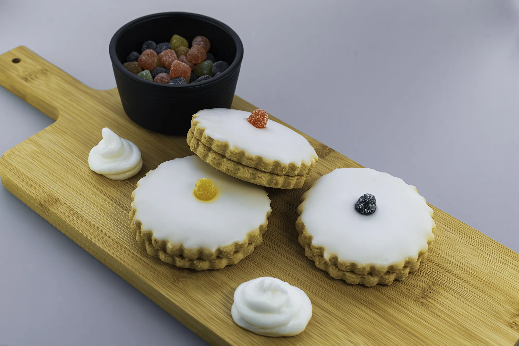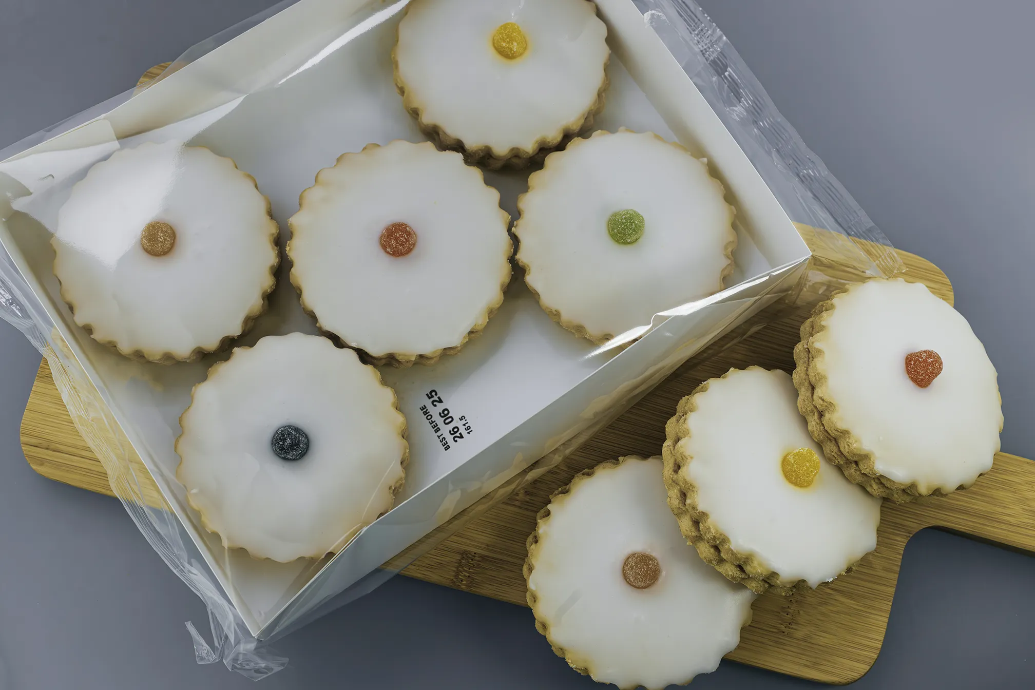 Sweet biscuits sandwiched together with jam and topped with icing and a jelly sweet.