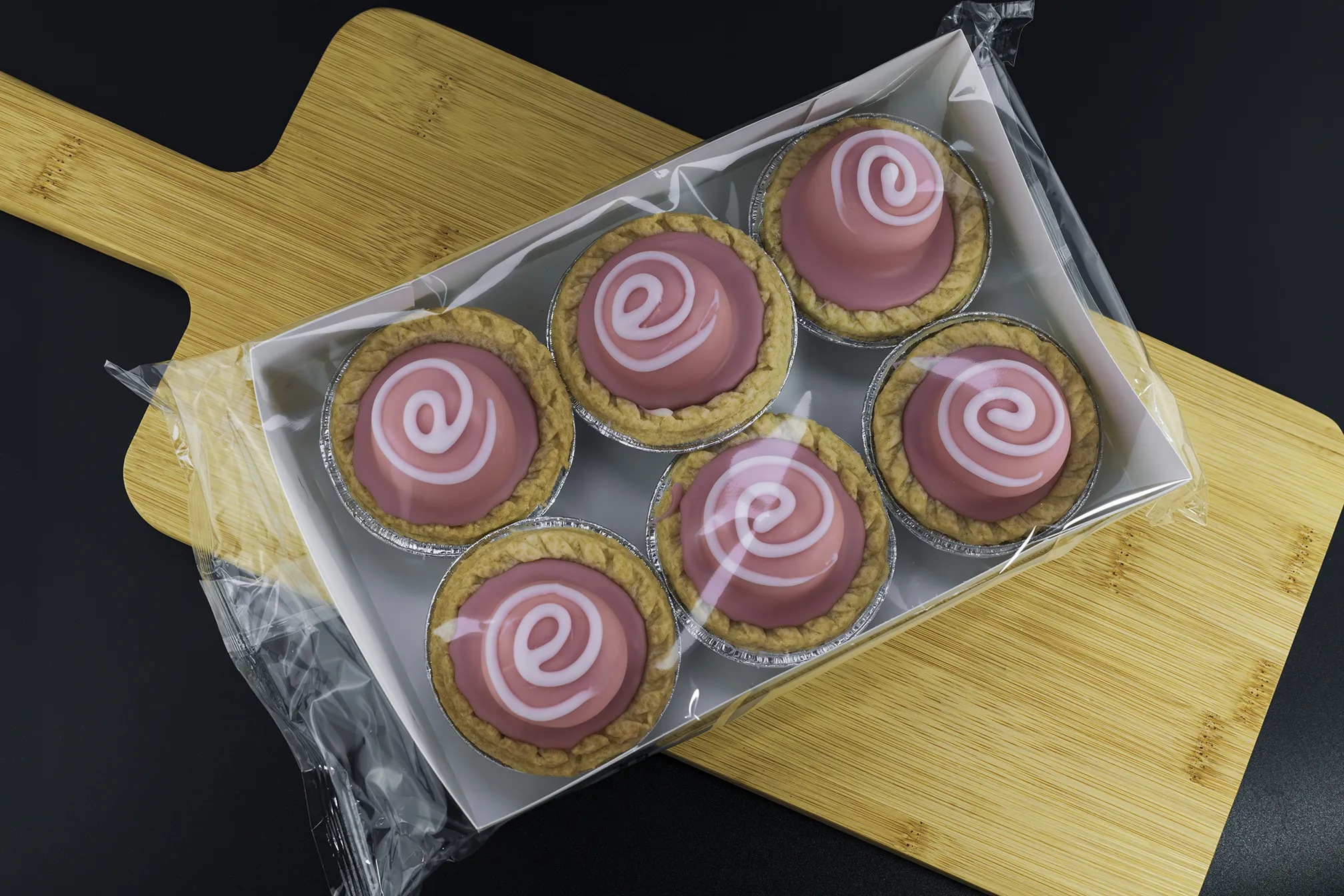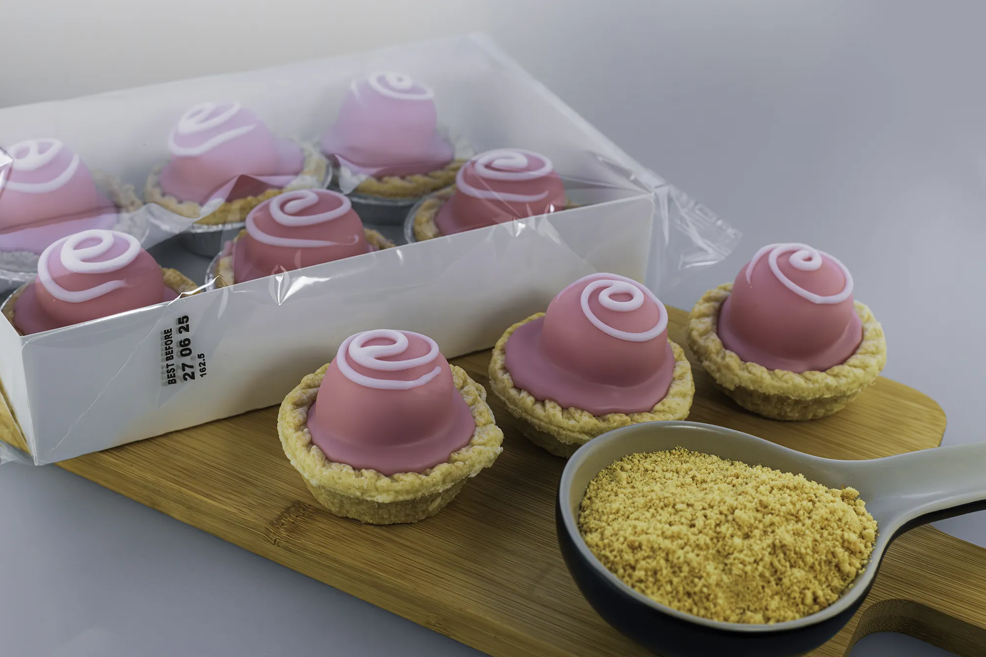 A sweet pastry cup, layered with raspberry flavour jelly and a creamy filling and topped with fondant.