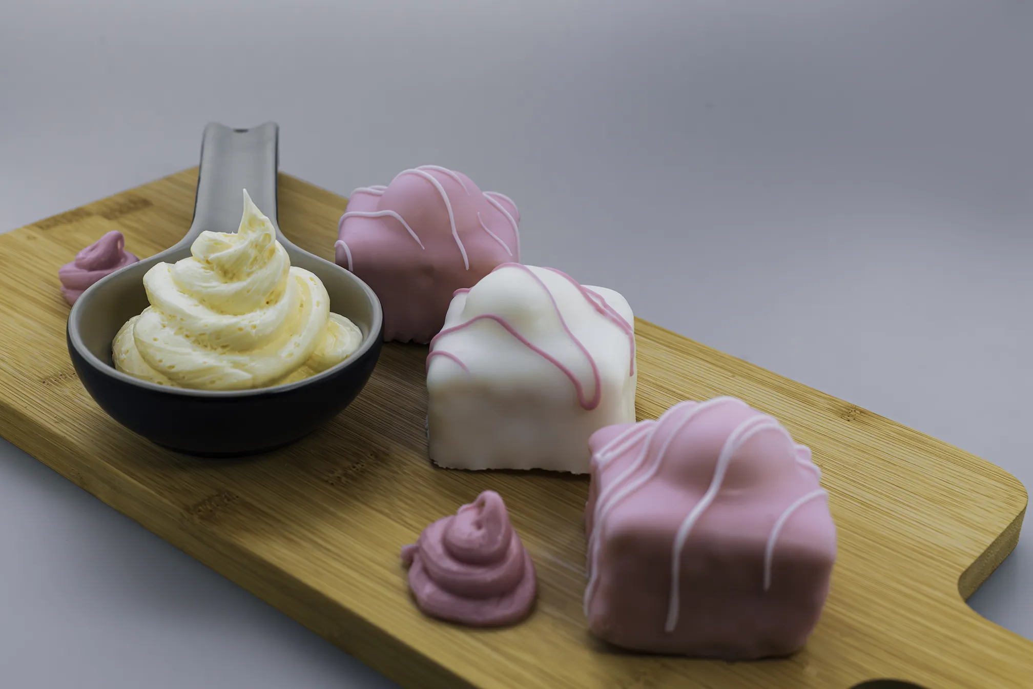 A soft sponge with a creamy topping, covered in fondant and finished with a piped swirl.