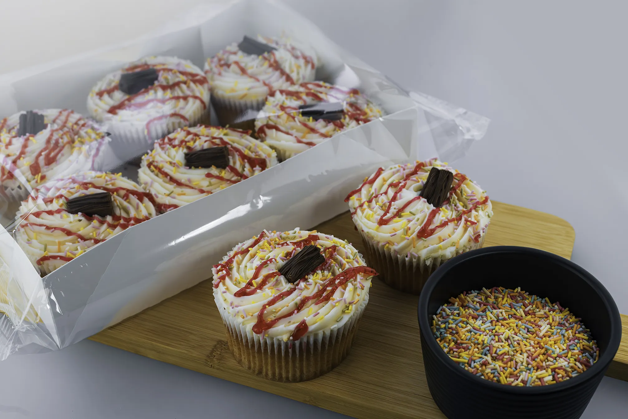 A moist sponge cake piped with a creamy vanilla frosting, decorated with raspberry flavour jelly and sugar strands, topped with a chocolate flake.