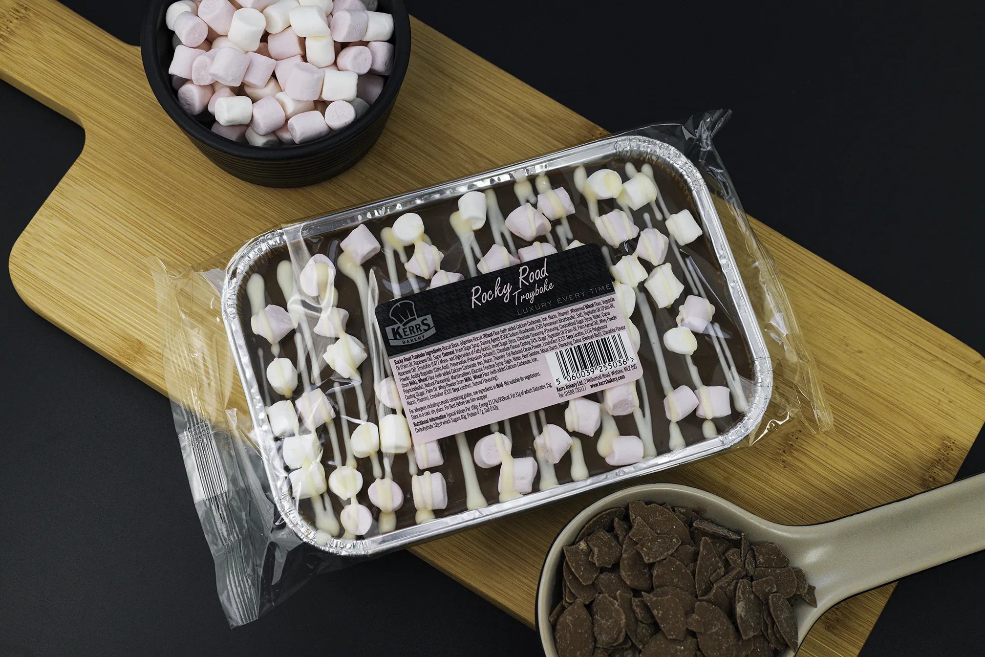 A crunchy biscuit base topped with mini marshmallows and a layer of milk chocolate flavour coating drizzled with white chocolate flavour coating.