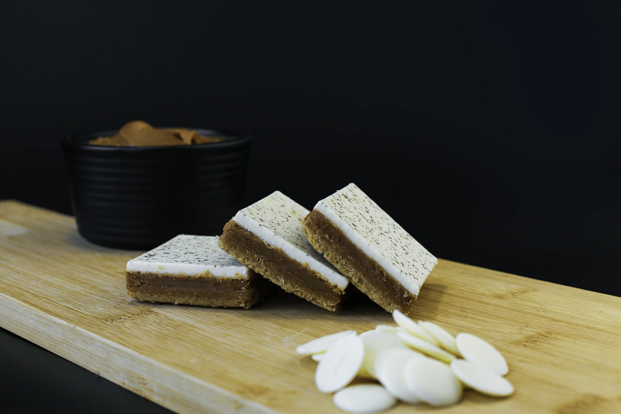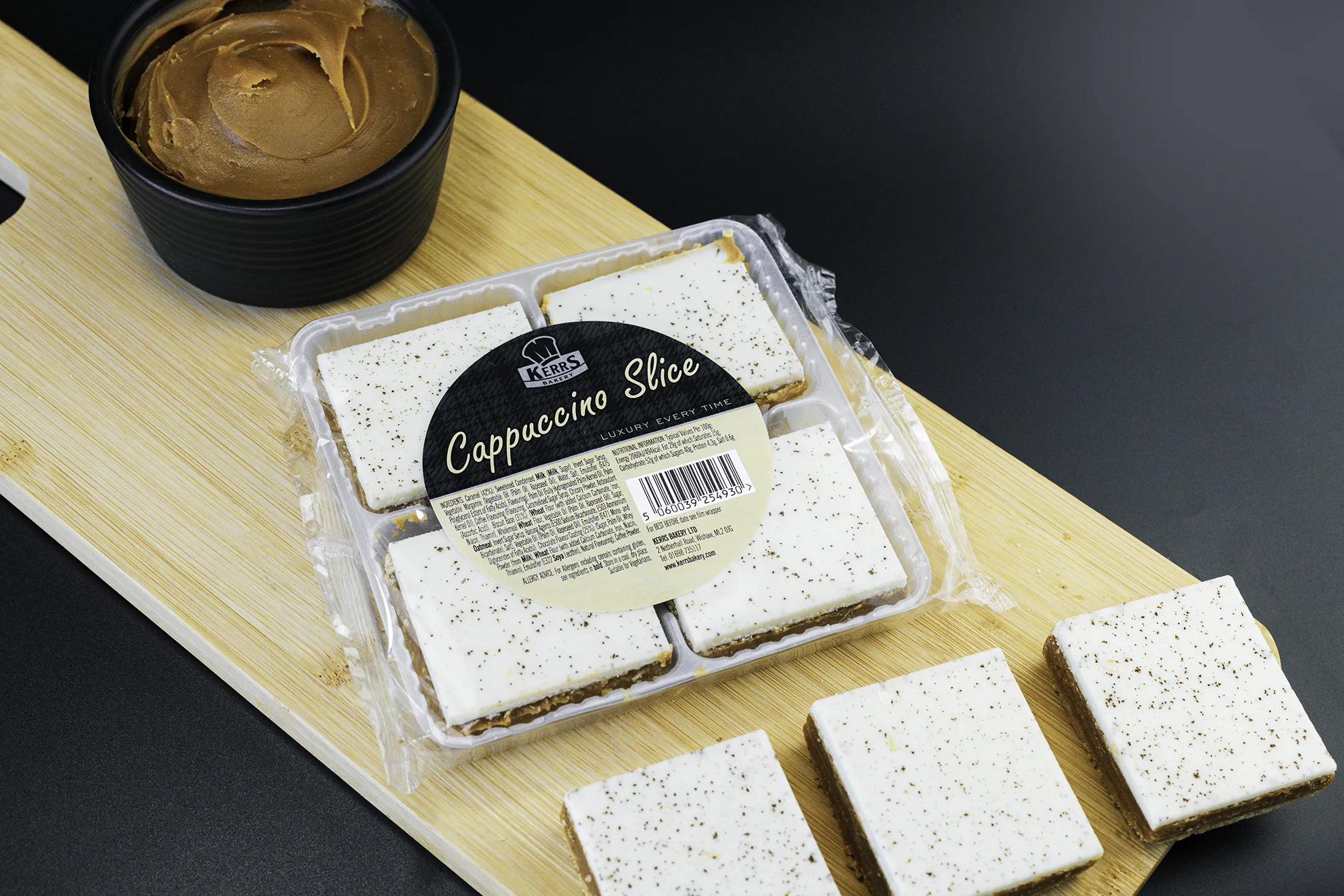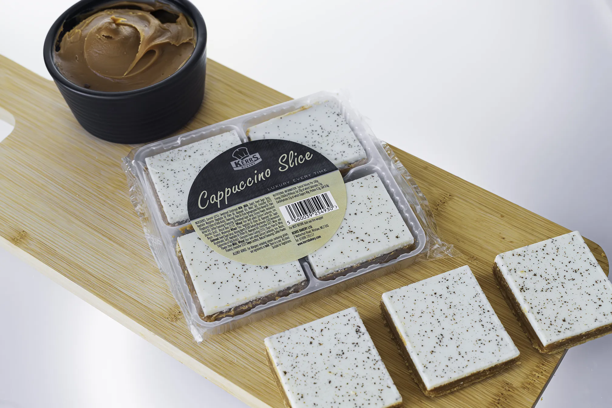 A biscuit base with a layer of coffee flavour caramel topped with white chocolate flavour coating and dusted with coffee powder.