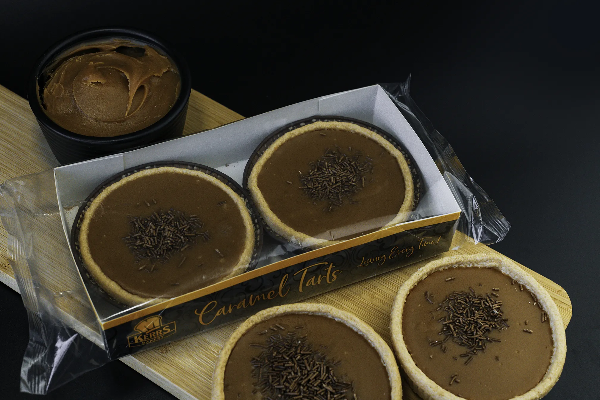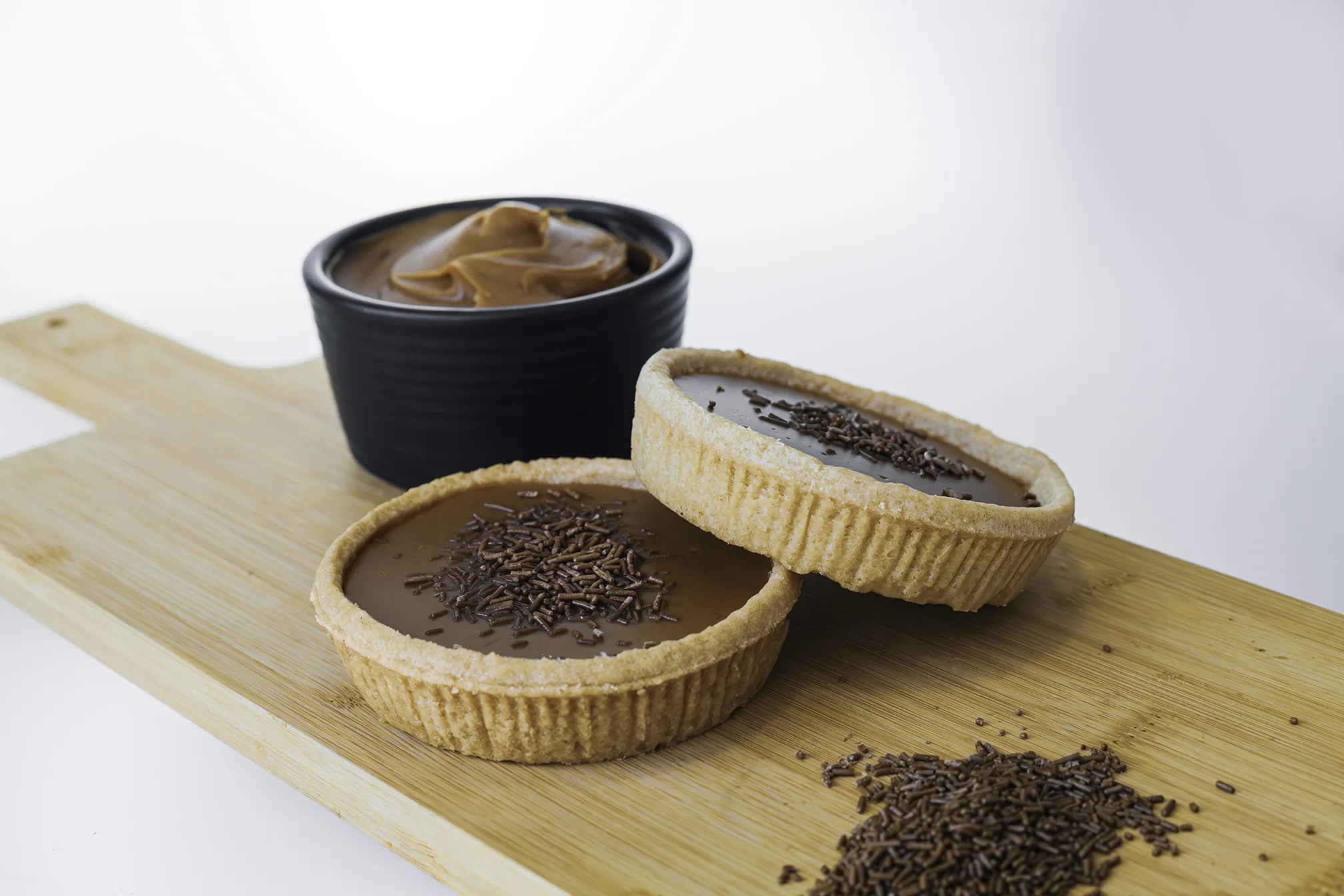 A crisp pastry case filled with a rich caramel and sprinkled with chocolate flavour vermicelli