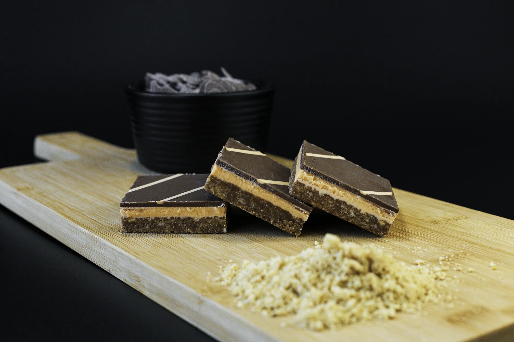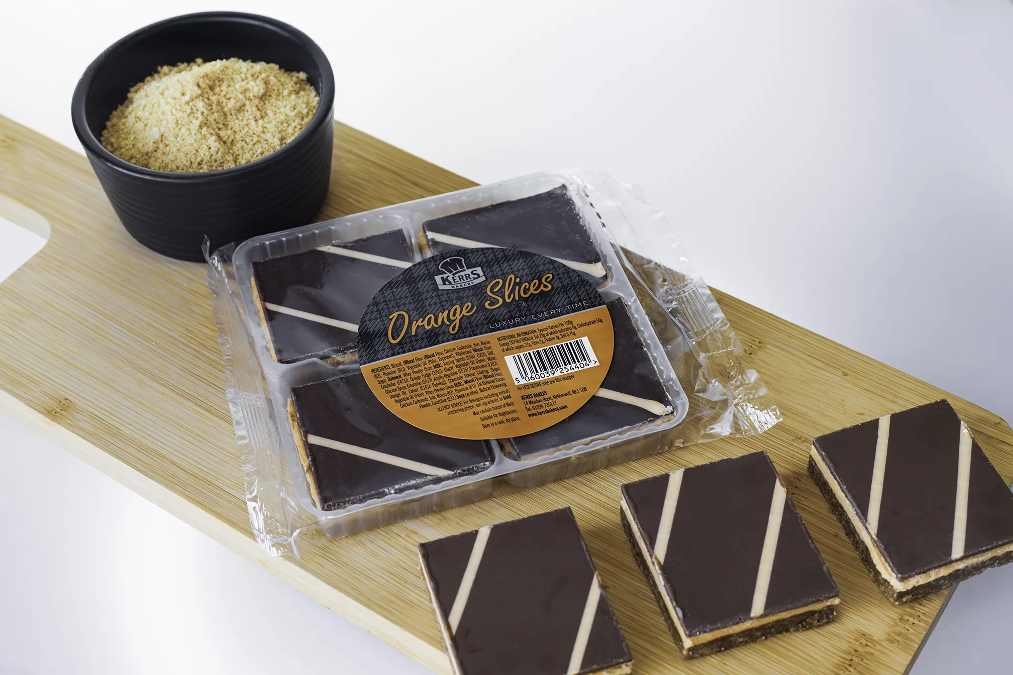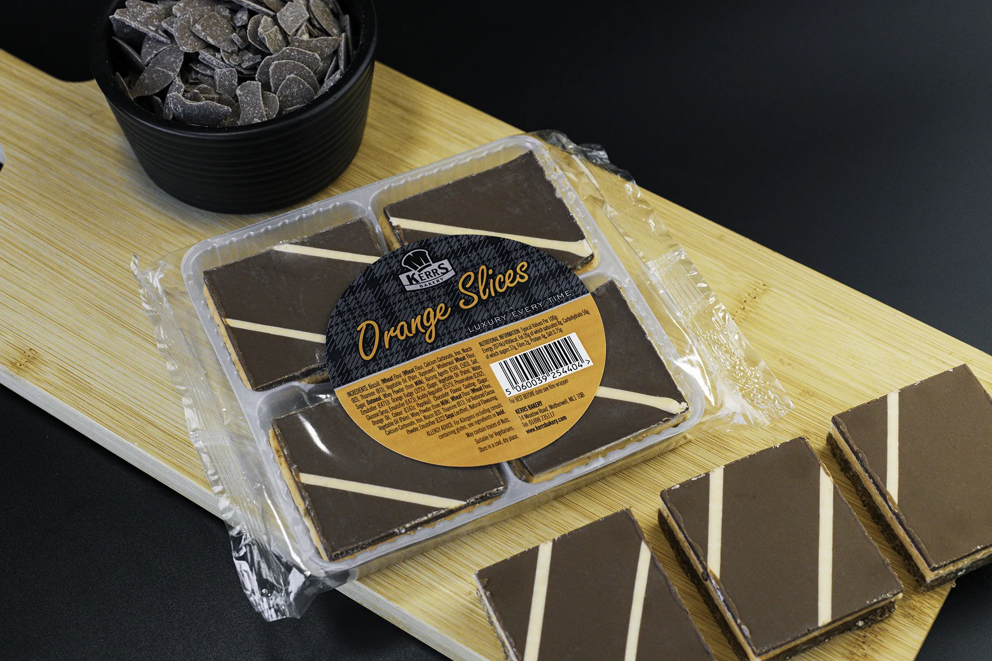 A crunchy biscuit base covered with an orange fondant, topped with a layer of milk chocolate flavour coating finished with a swirl of orange fondant.