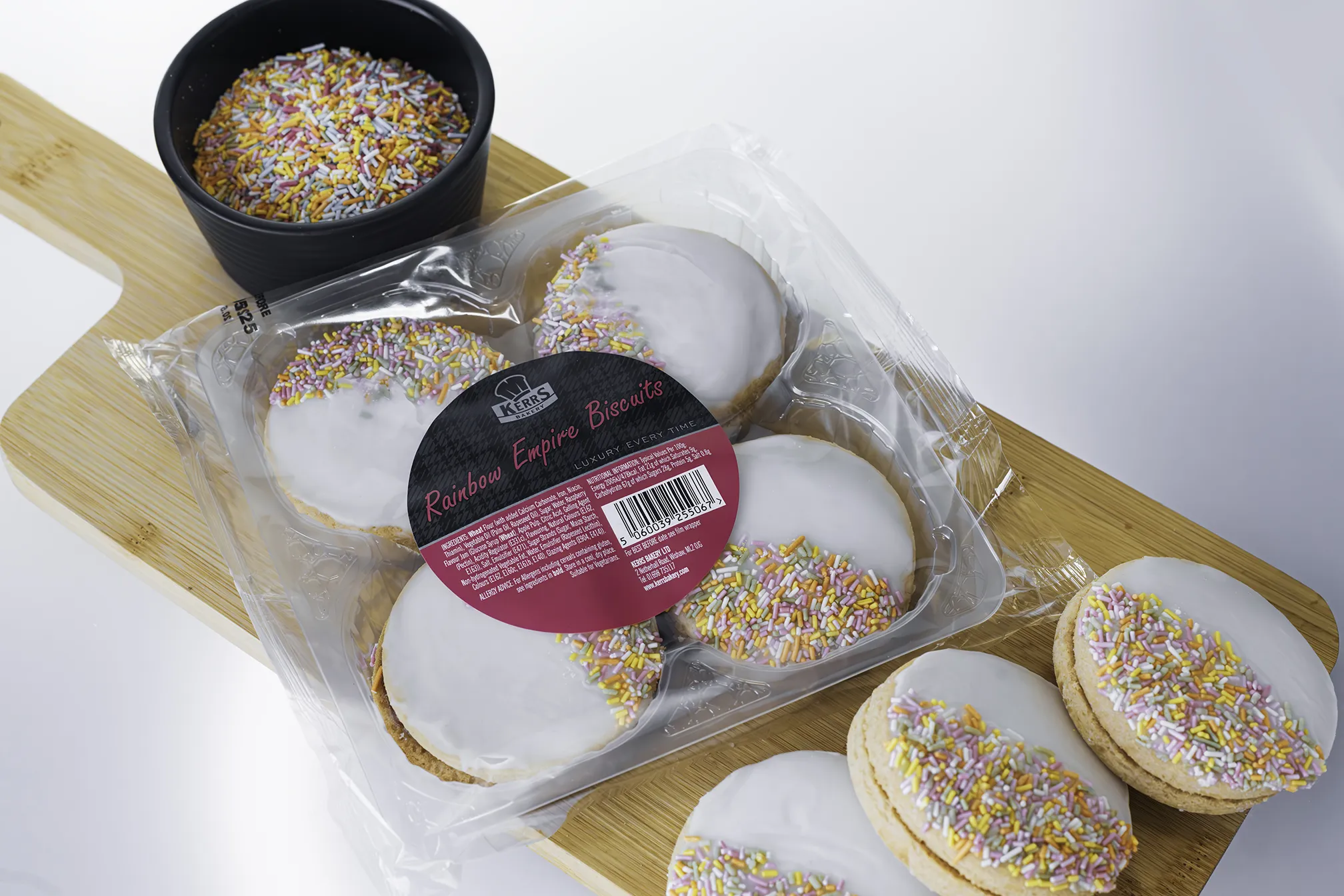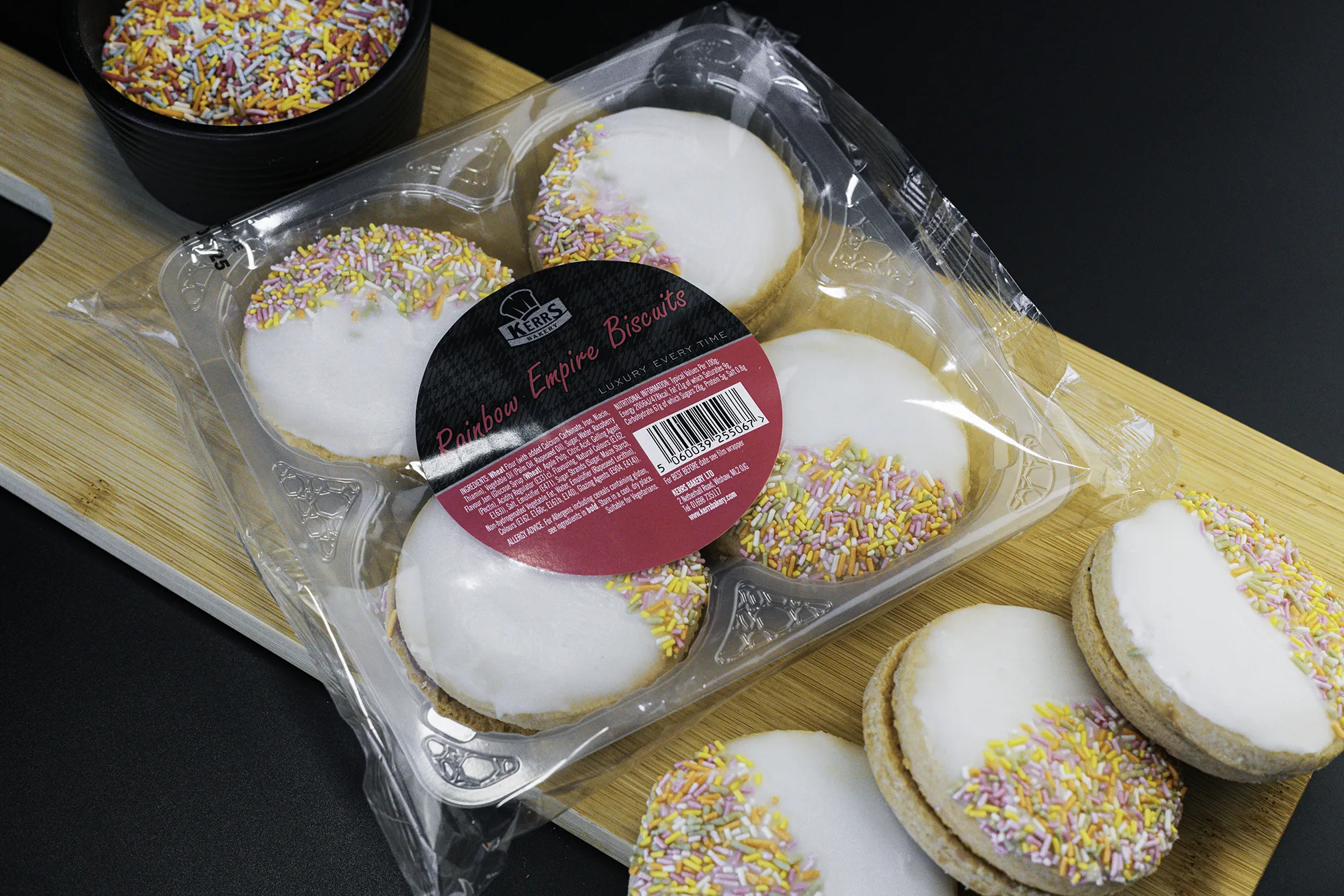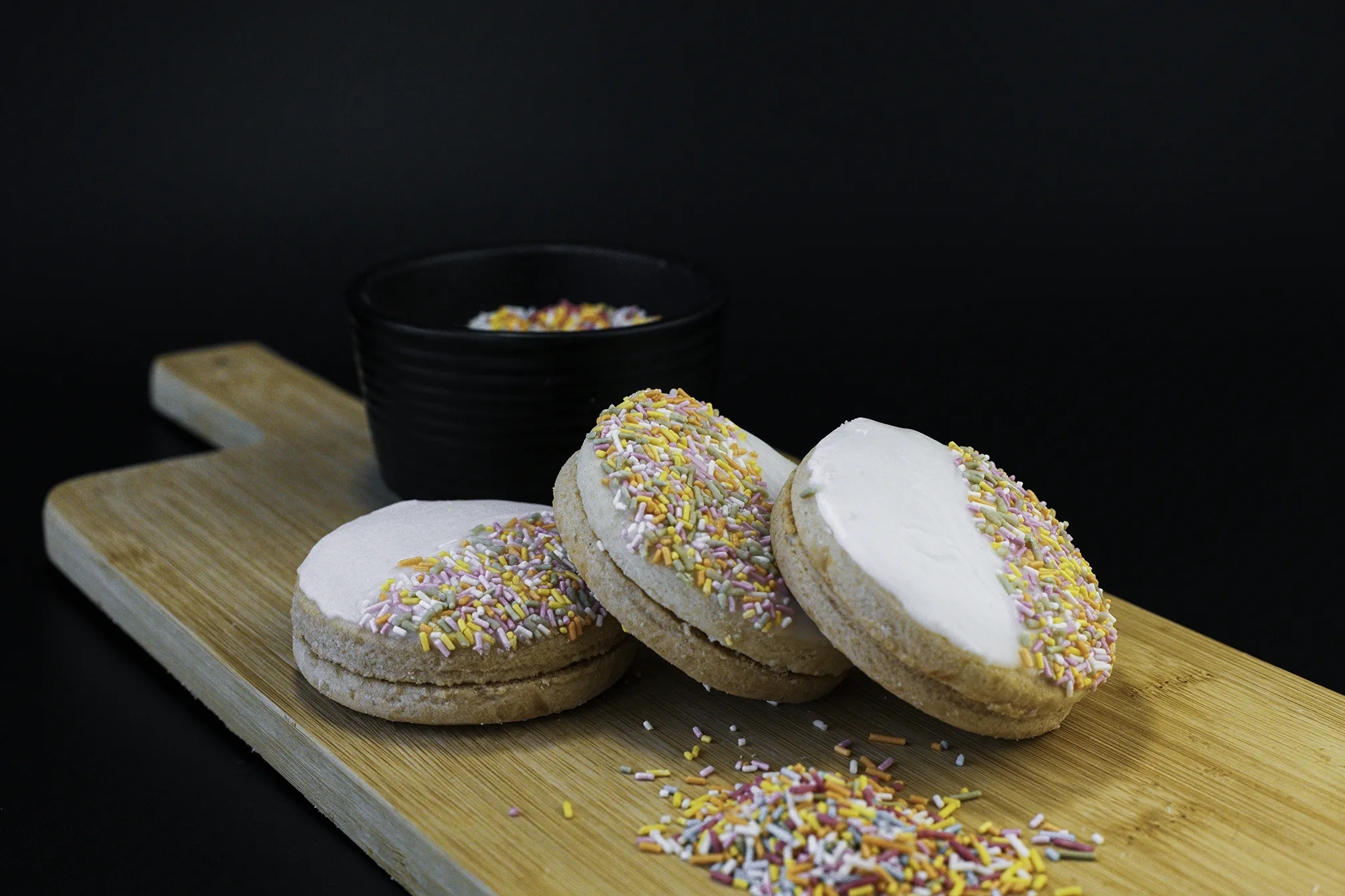 Sweet biscuits sandwiched together with jam, topped with a layer of icing and decorated with sugar strands