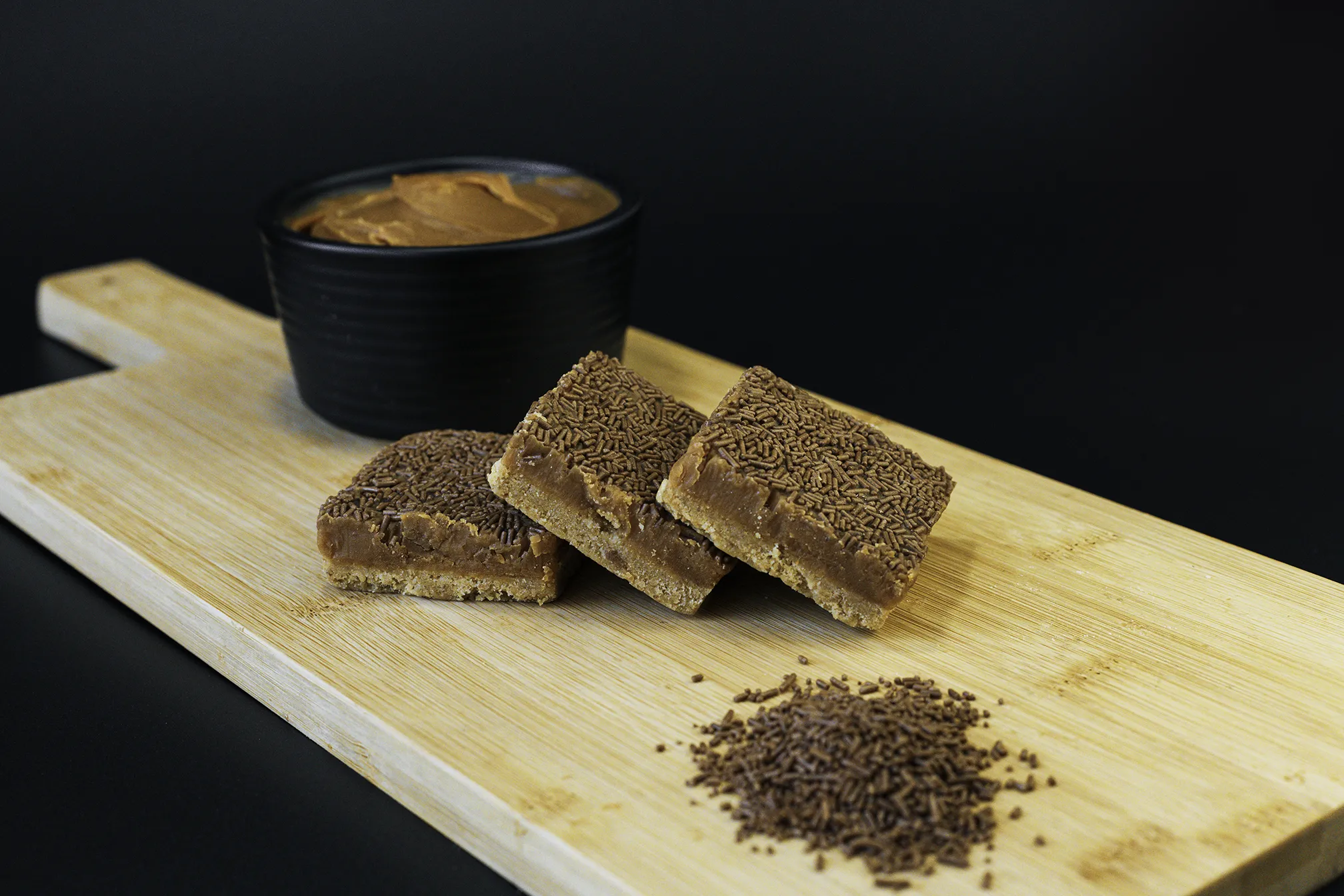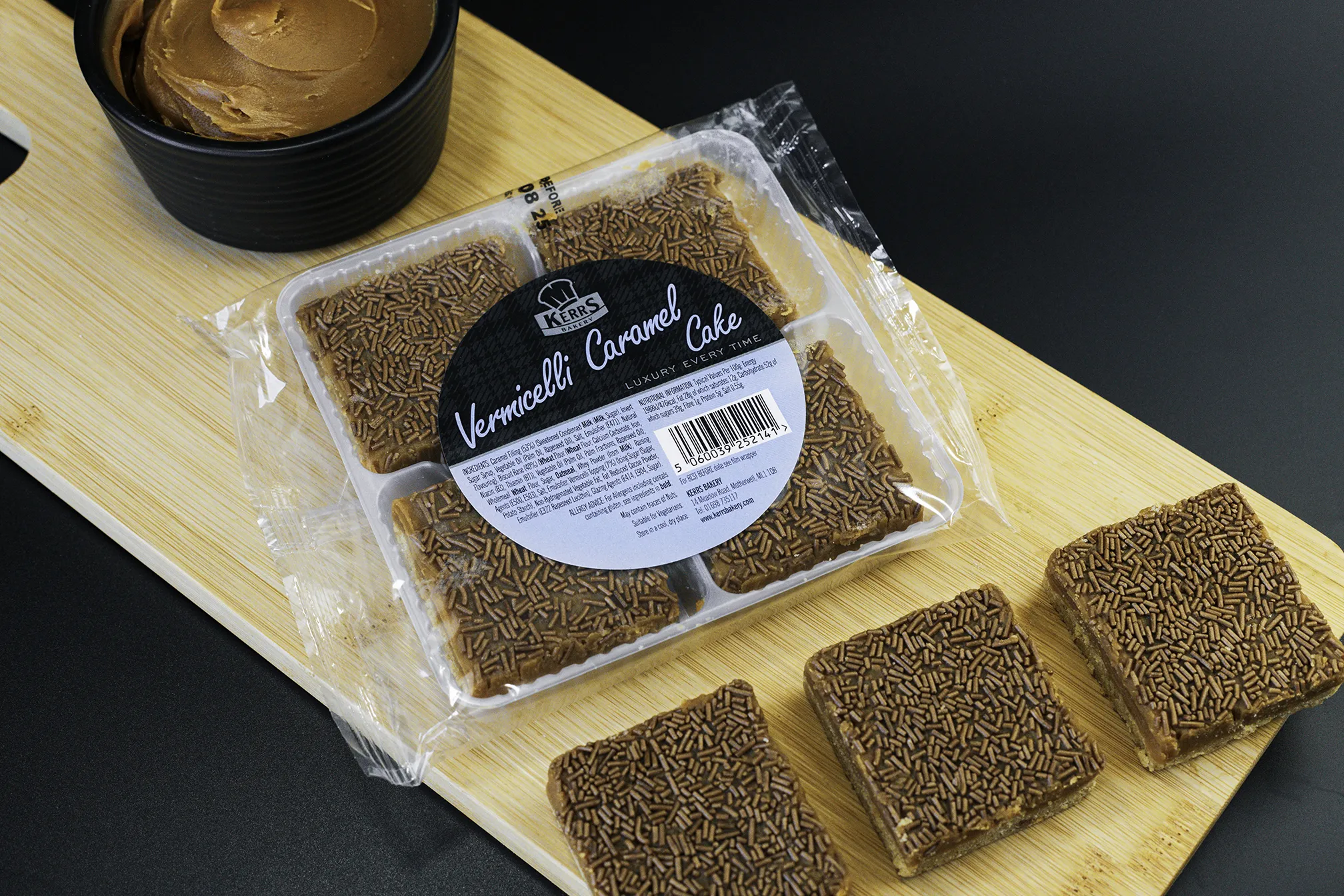 A crunchy digestive base covered with rich, golden caramel and finished with a layer of chocolate flavour vermicelli.