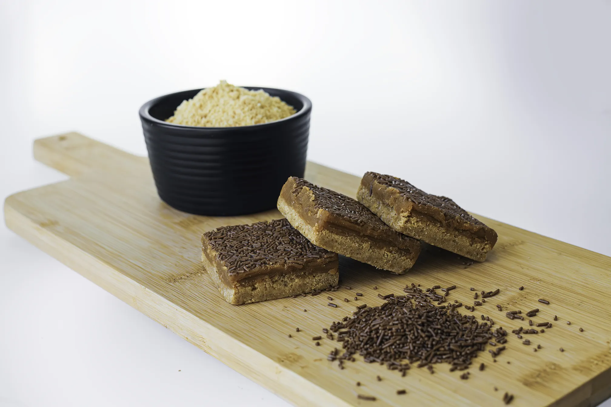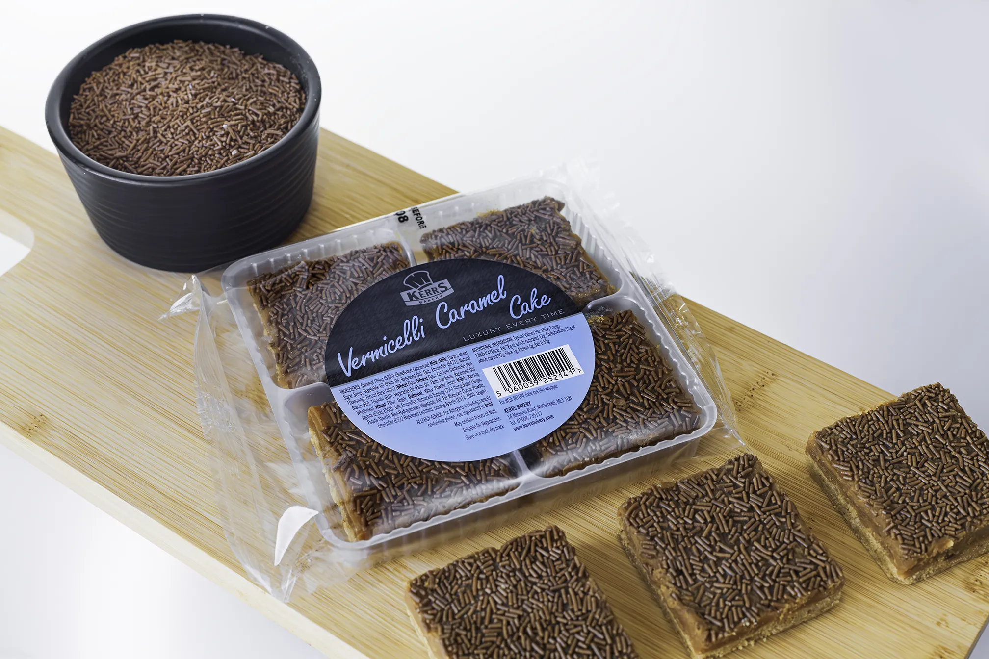 A crunchy digestive base covered with rich, golden caramel and finished with a layer of chocolate flavour vermicelli
