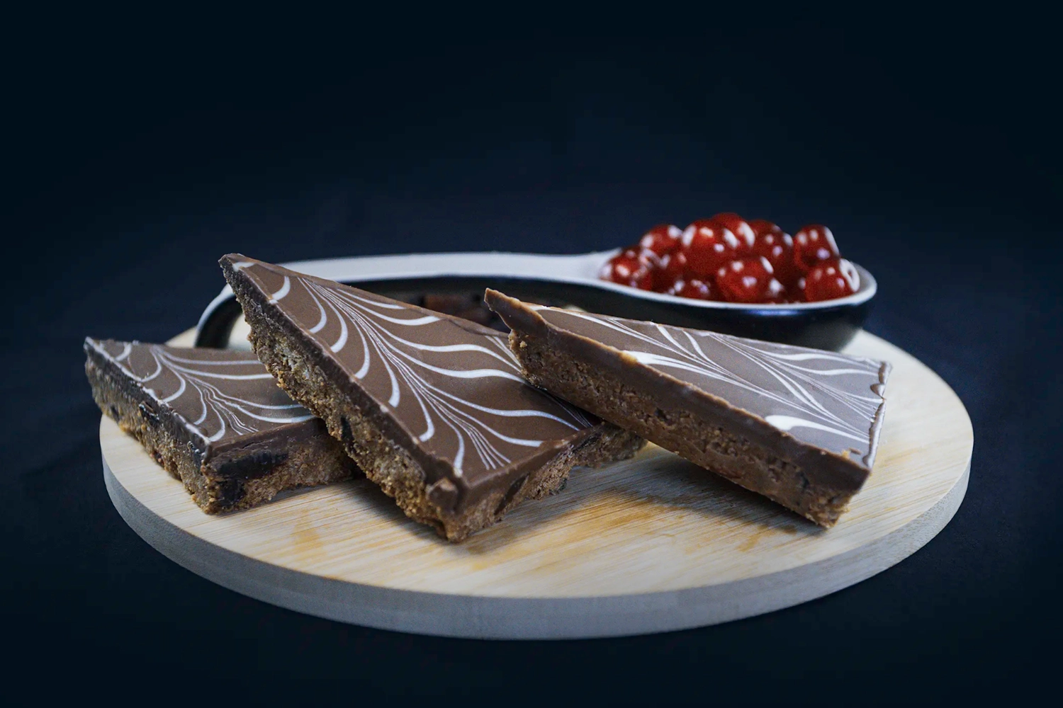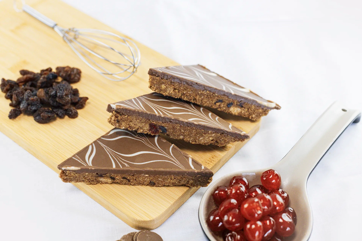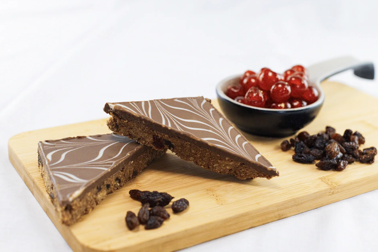 A digestive biscuit base, with a rich mix of sultanas and glace cherries, finished with a smooth milk chocolate flavour coating.