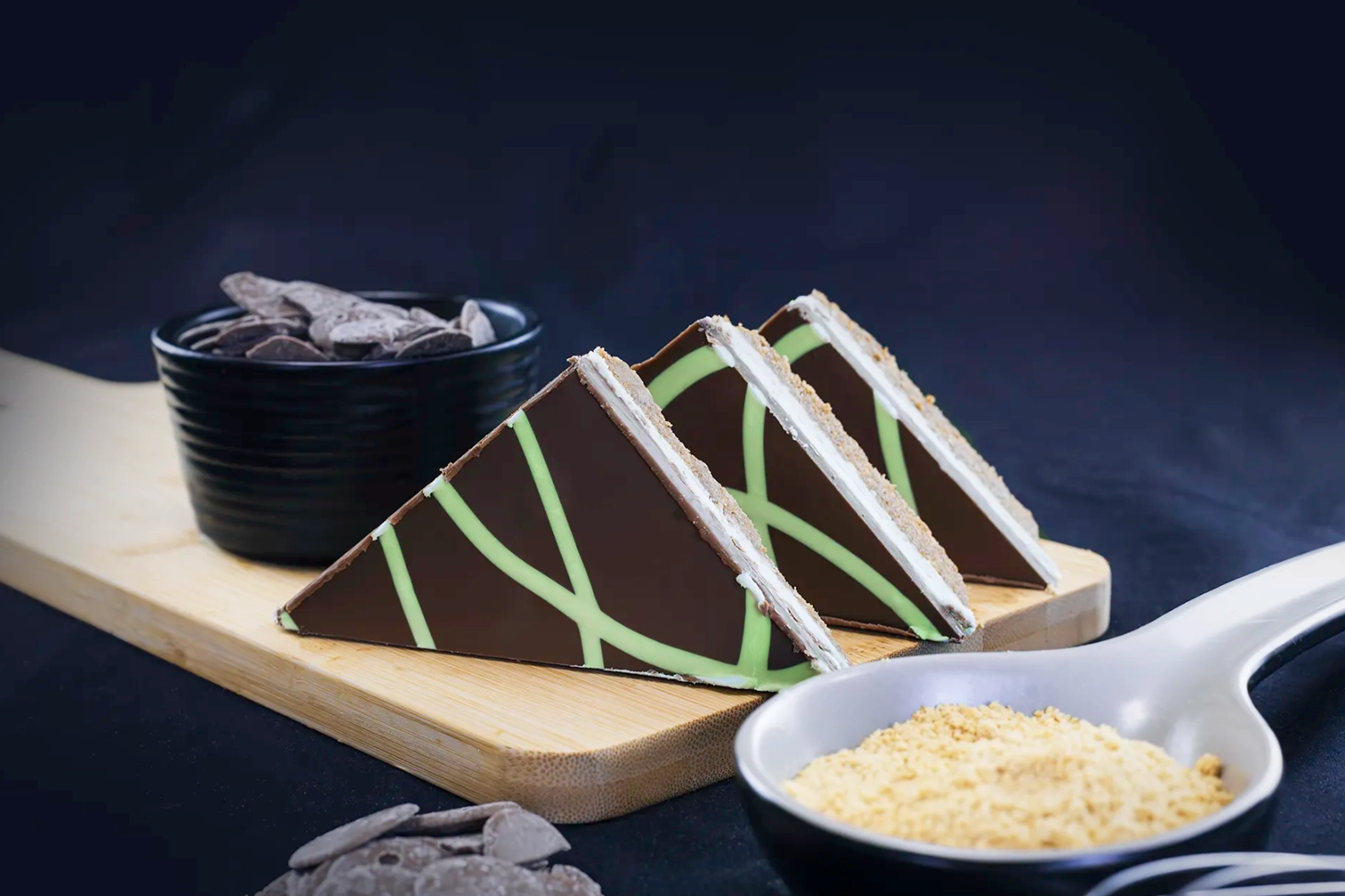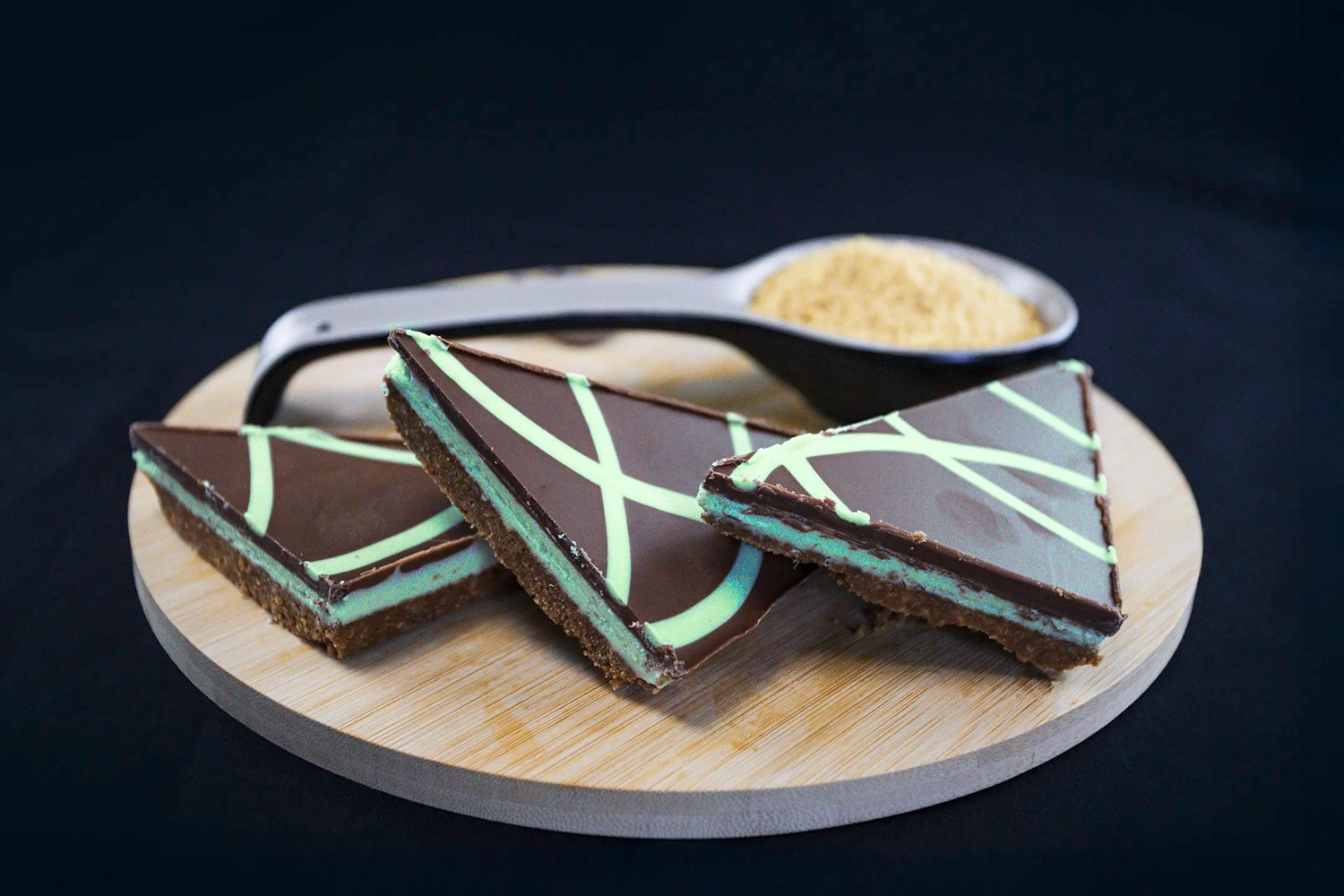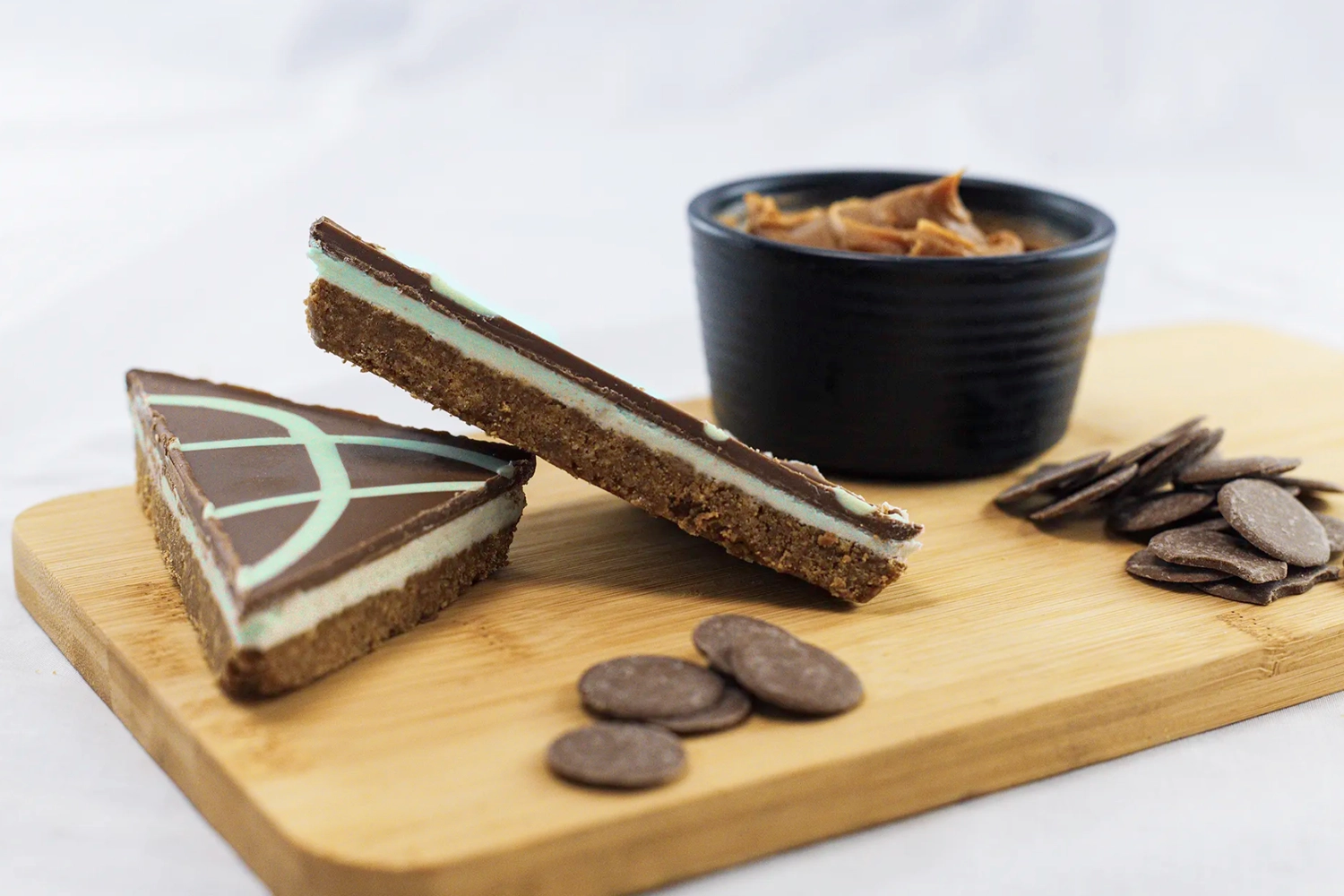 A crunchy digestive biscuit base layered with a mint flavoured fondant, topped with a layer of milk chocolate flavour coating finished with a mint fondant swirl.
