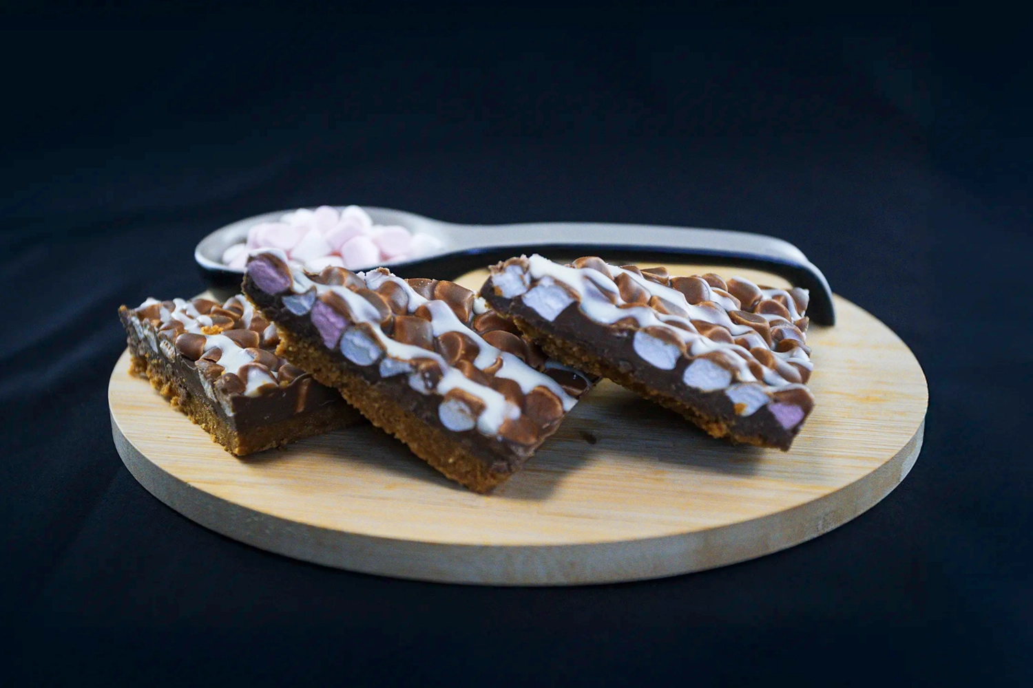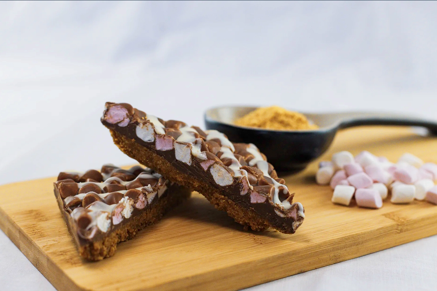 A crunchy biscuit base topped with mini marshmallows and a layer of milk chocolate flavour coating drizzled with white chocolate flavour coating.