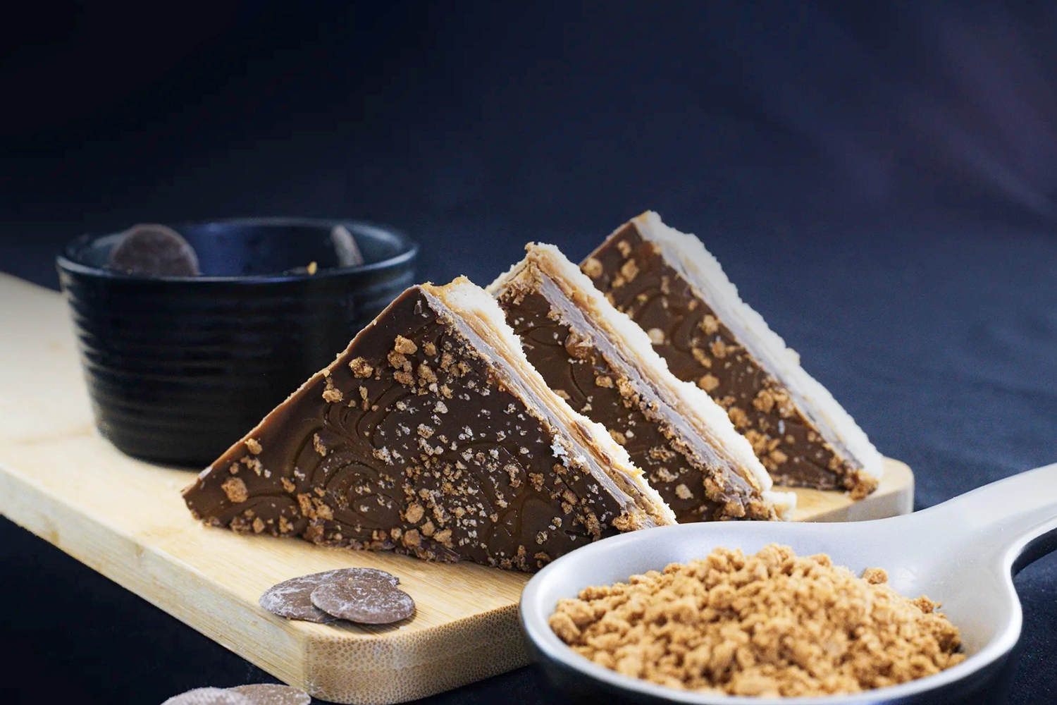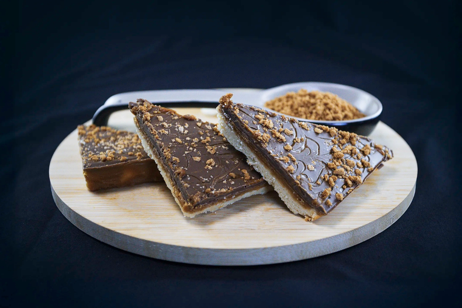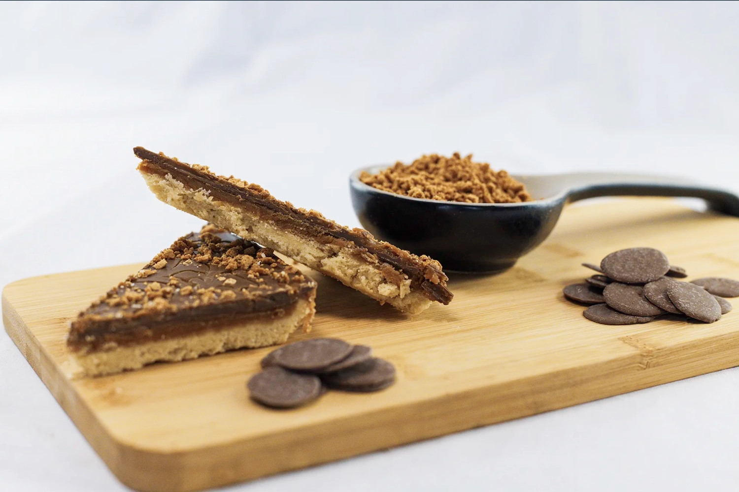 A baked biscuit base with a layer of speculoos flavour caramel topped with milk chocolate flavour coating, and decorated with speculoos flavour crumb.