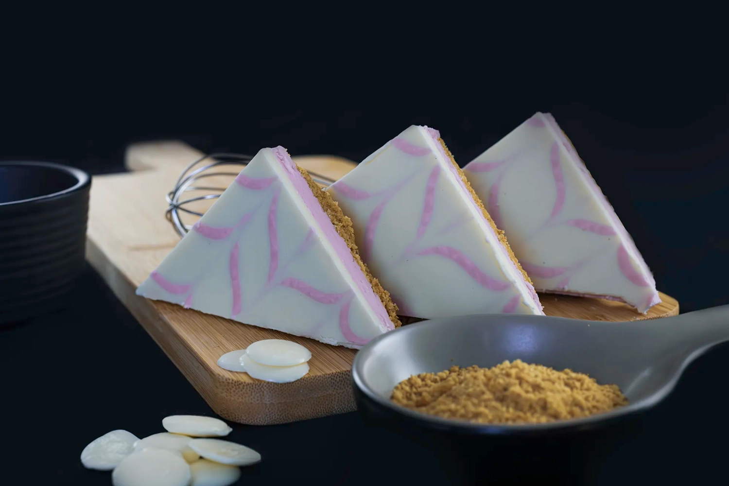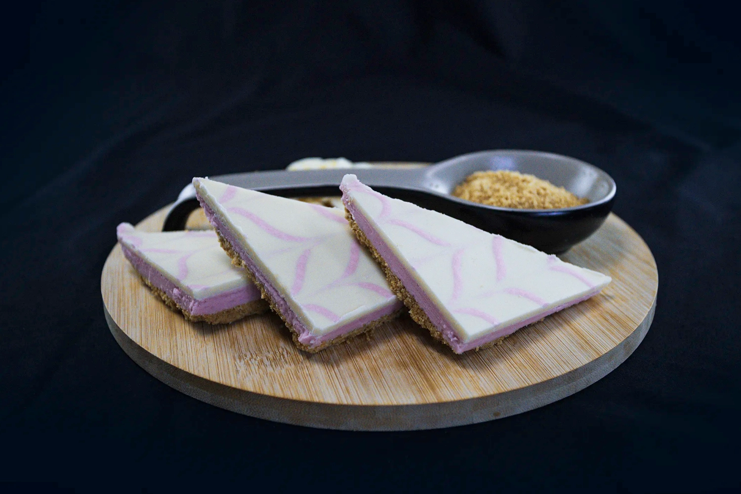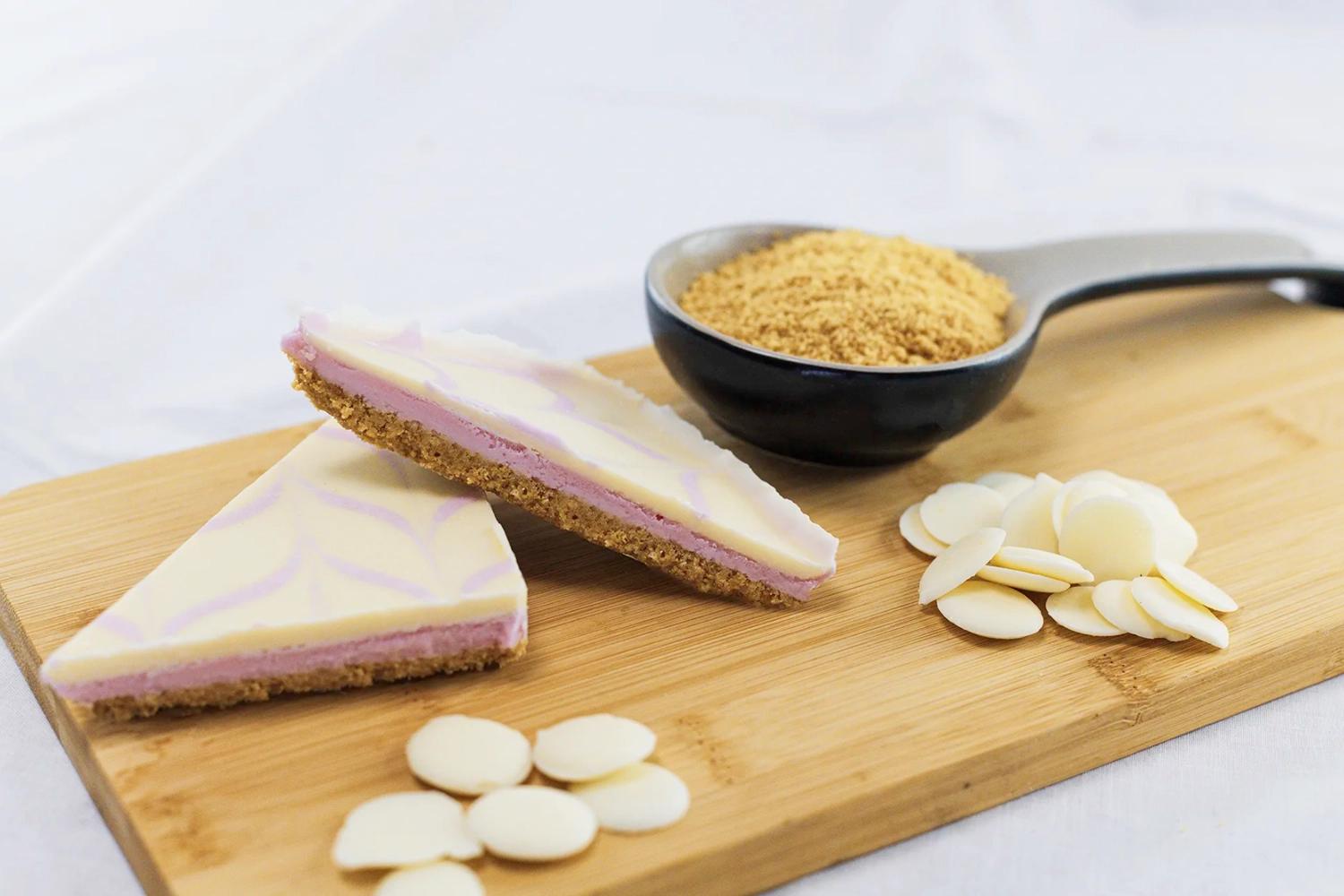 A crunchy digestive biscuit base layered with a strawberry flavour fondant, topped with a layer of white chocolate flavour coating feathered with strawberry fondant.